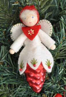 Twee engeltjes met een lijfje van een Dennenappel kerstbal in twee kleuren rood. Romee is 9cm hoog.